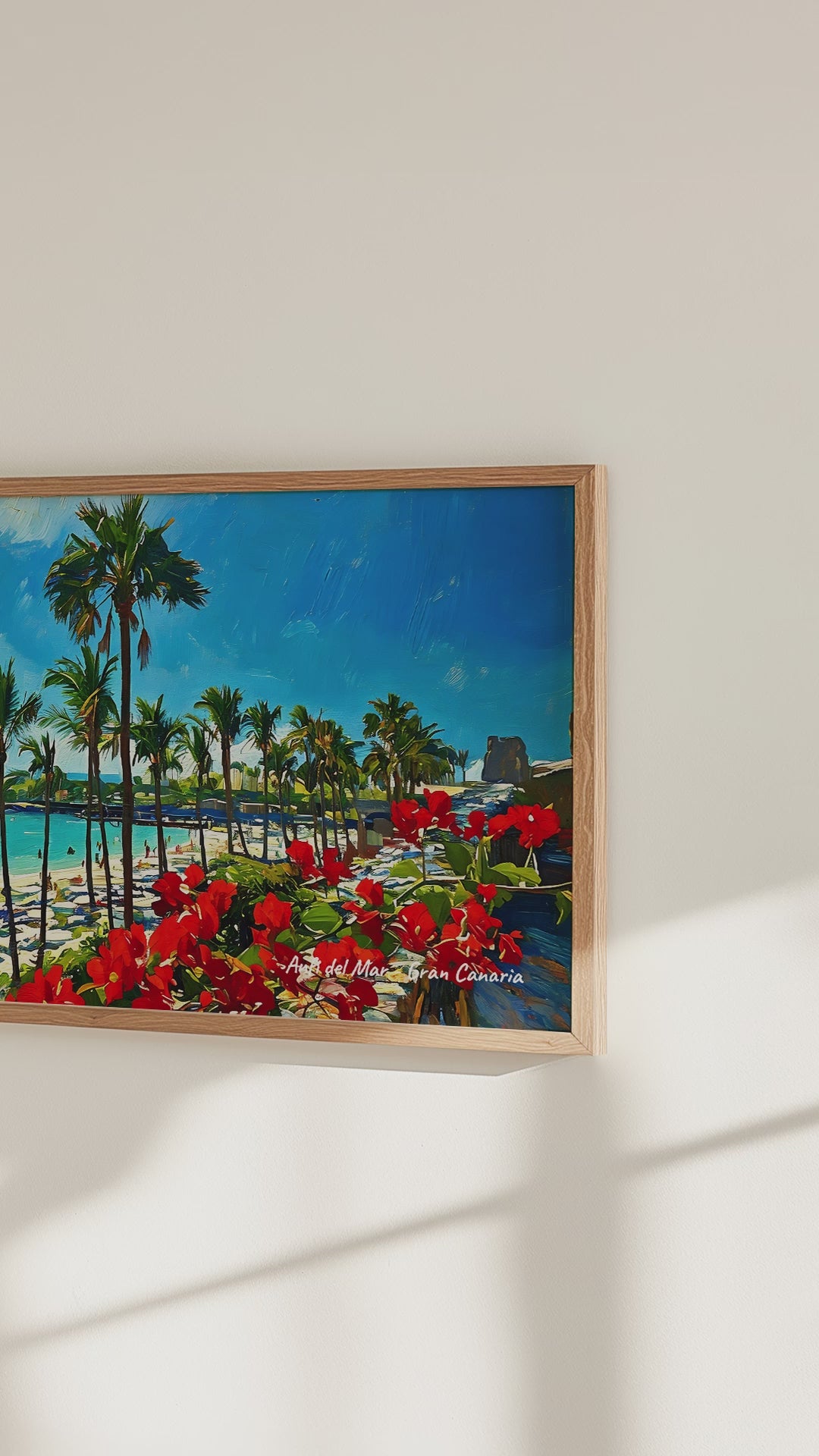 Impresa en lienzo premium 100 % algodón, esta pieza lleva a tu hogar u oficina la atmósfera relajada del sur de Gran Canaria. Sus colores intensos y su paisaje tropical crean una decoración vibrante inspirada en la vida junto al Atlántico.